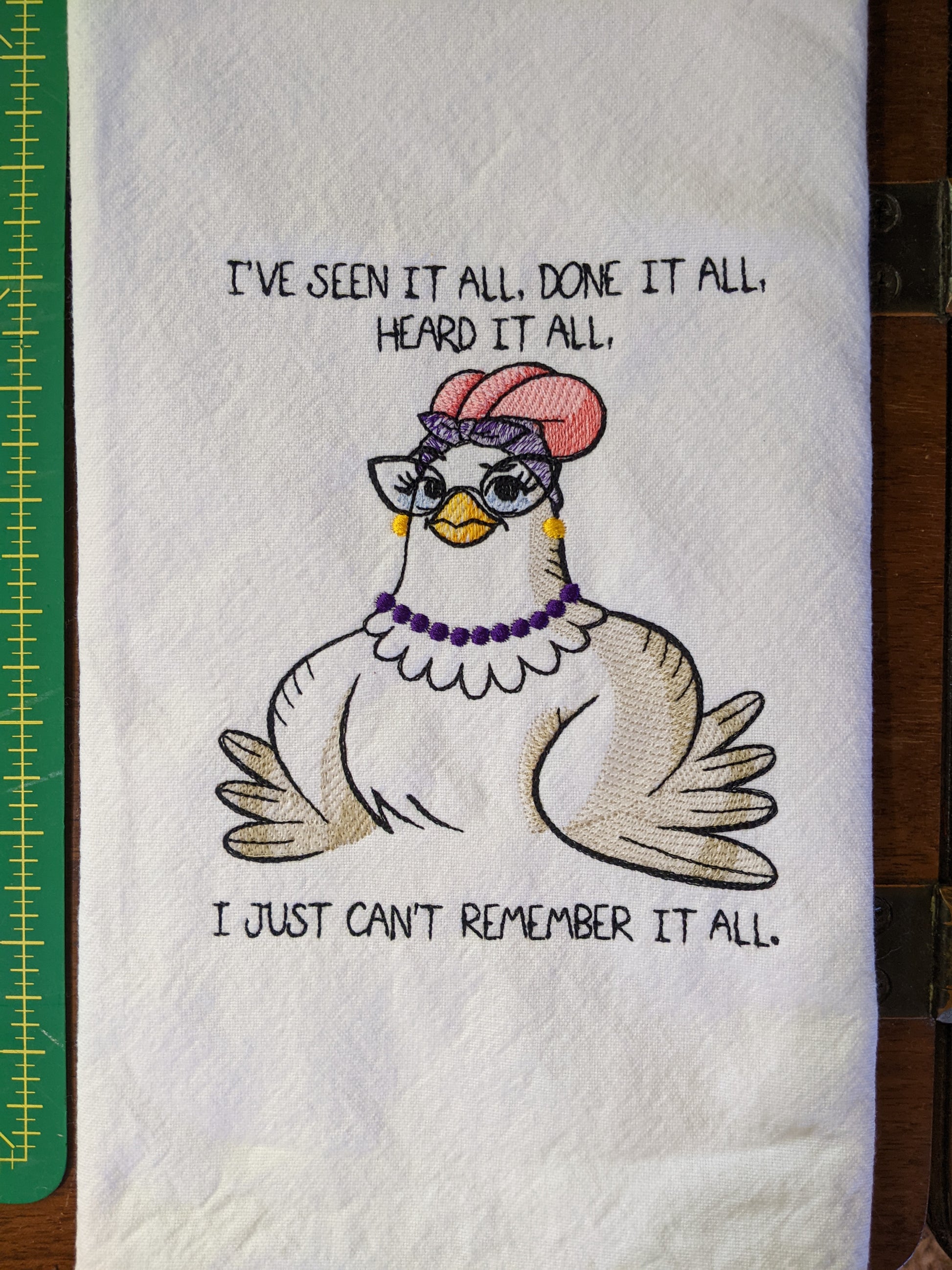 This is an embroidered kitchen tea towel. This towel has a sassy chicken. It says "I've seen it all, done it all, heard it all; I just can't remember it all." This would be a great gift or just treat yourself to a fun, new towel for your kitchen! This design is available in white or cream.