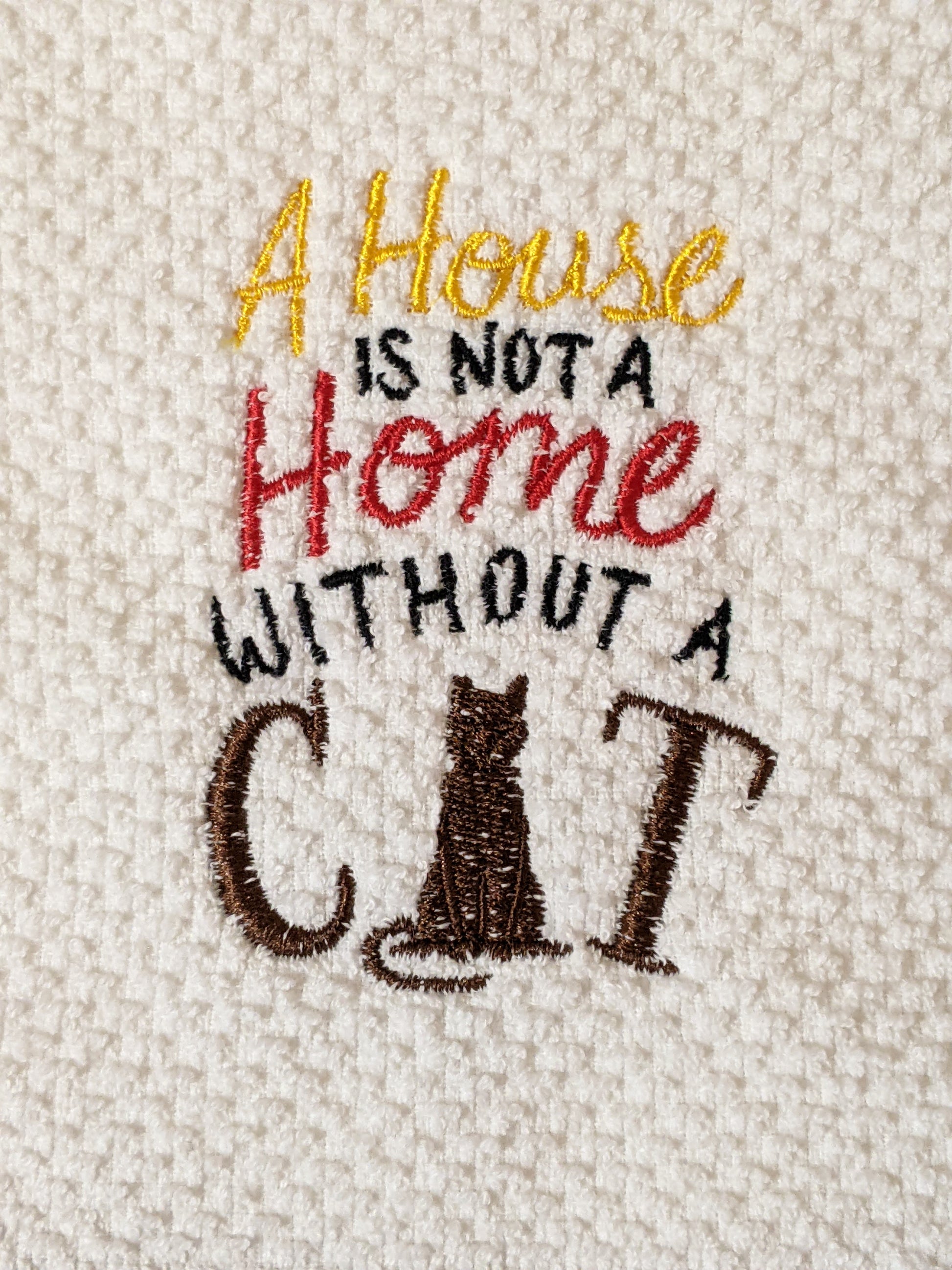 This is an embroidered kitchen towel with either "A House Is Not A Home Without A Cat/Dog"  This would be a great gift or just treat yourself to a fun, new towel for your kitchen or bath!