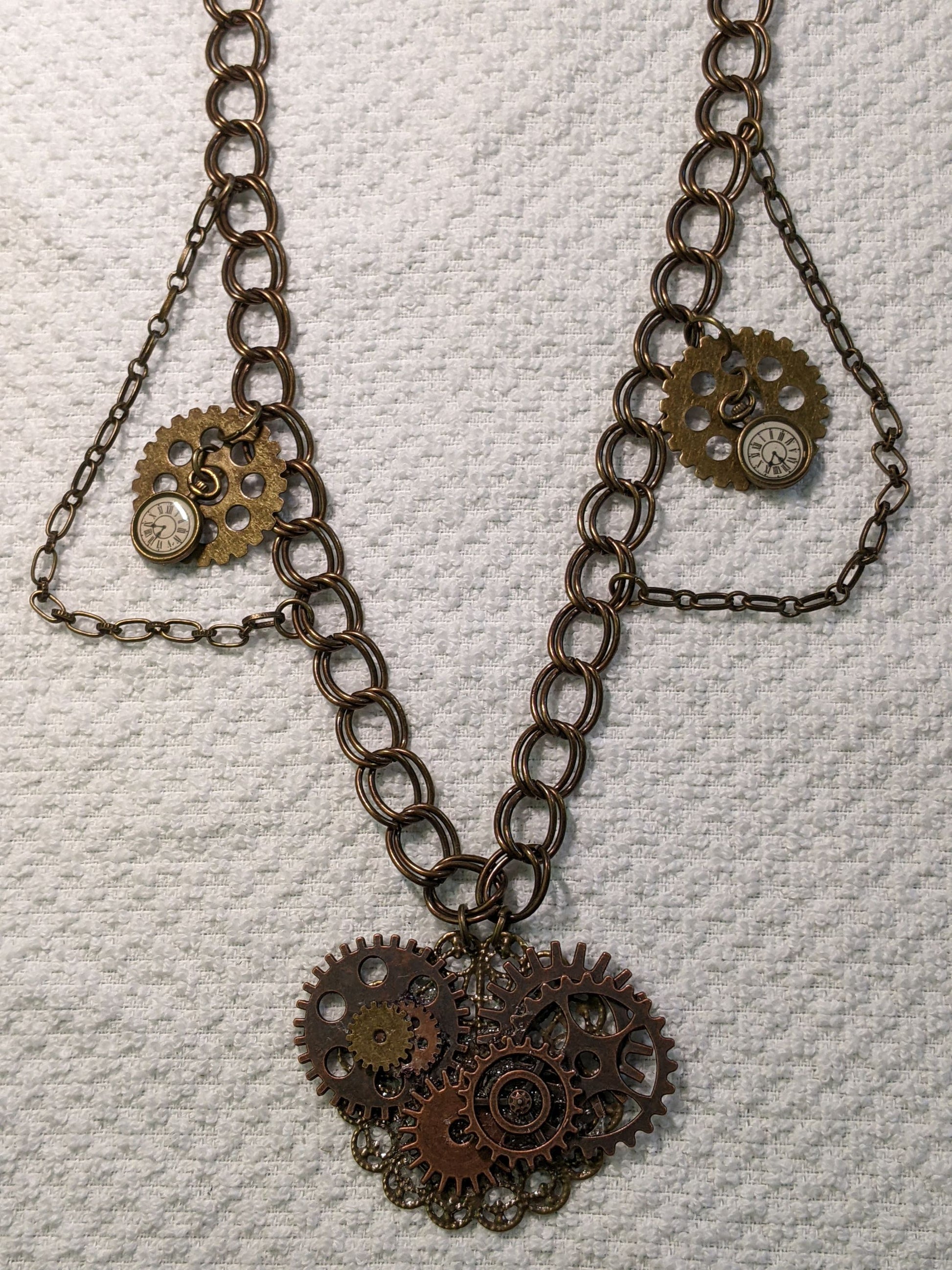 This is a necklace in a steampunk theme. It is made up of chains and charms The necklace is approx 24 inches, with a 2 inch extender (not including the main piece that hangs down).