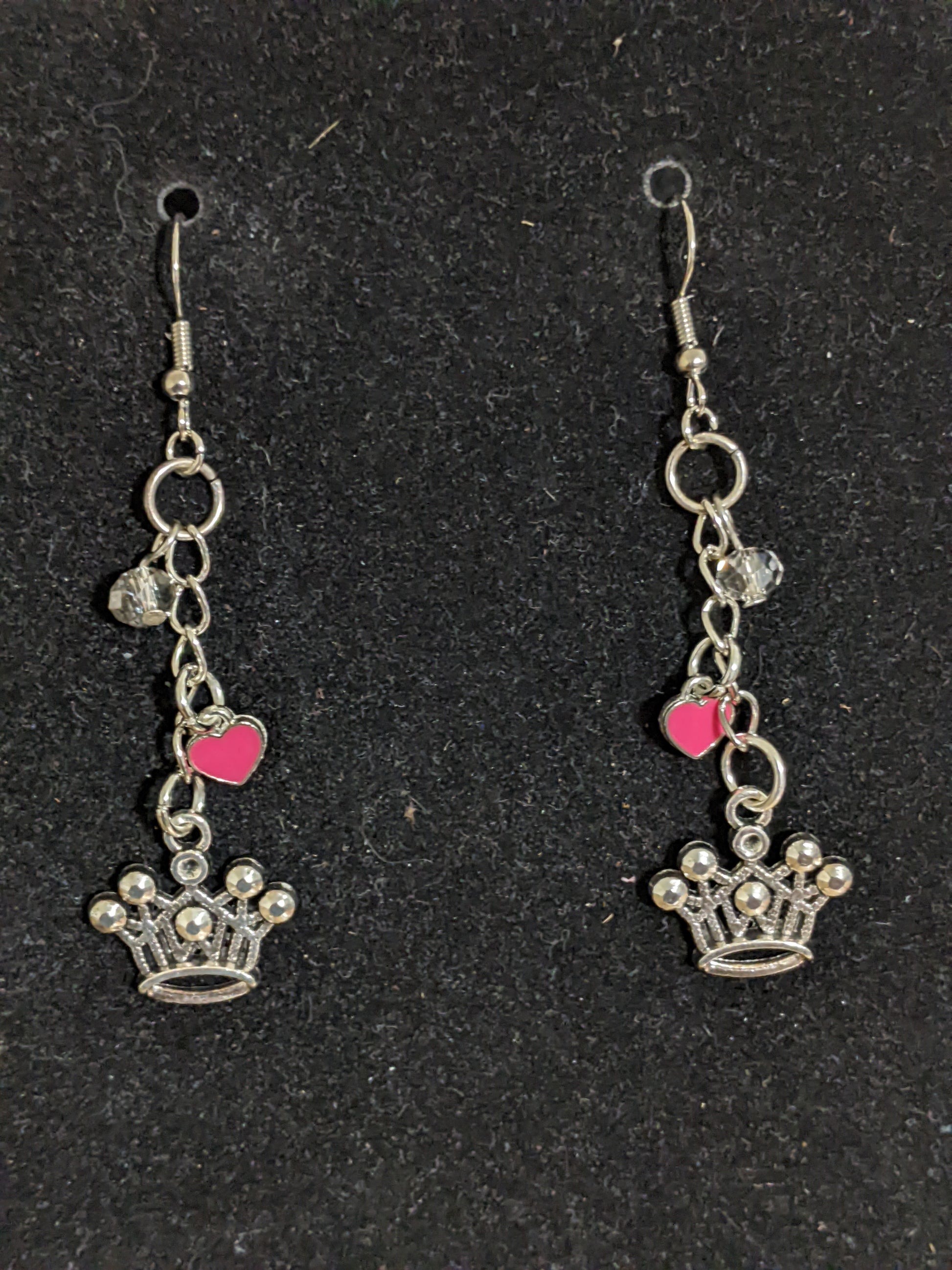 This pair is comprised of a silvertone chain with beads, pink hearts and crown charms, and hung on fish hook wires. These are antique silver/pewter in color. The fish hook wires are nickel free, and I include plastic stops.