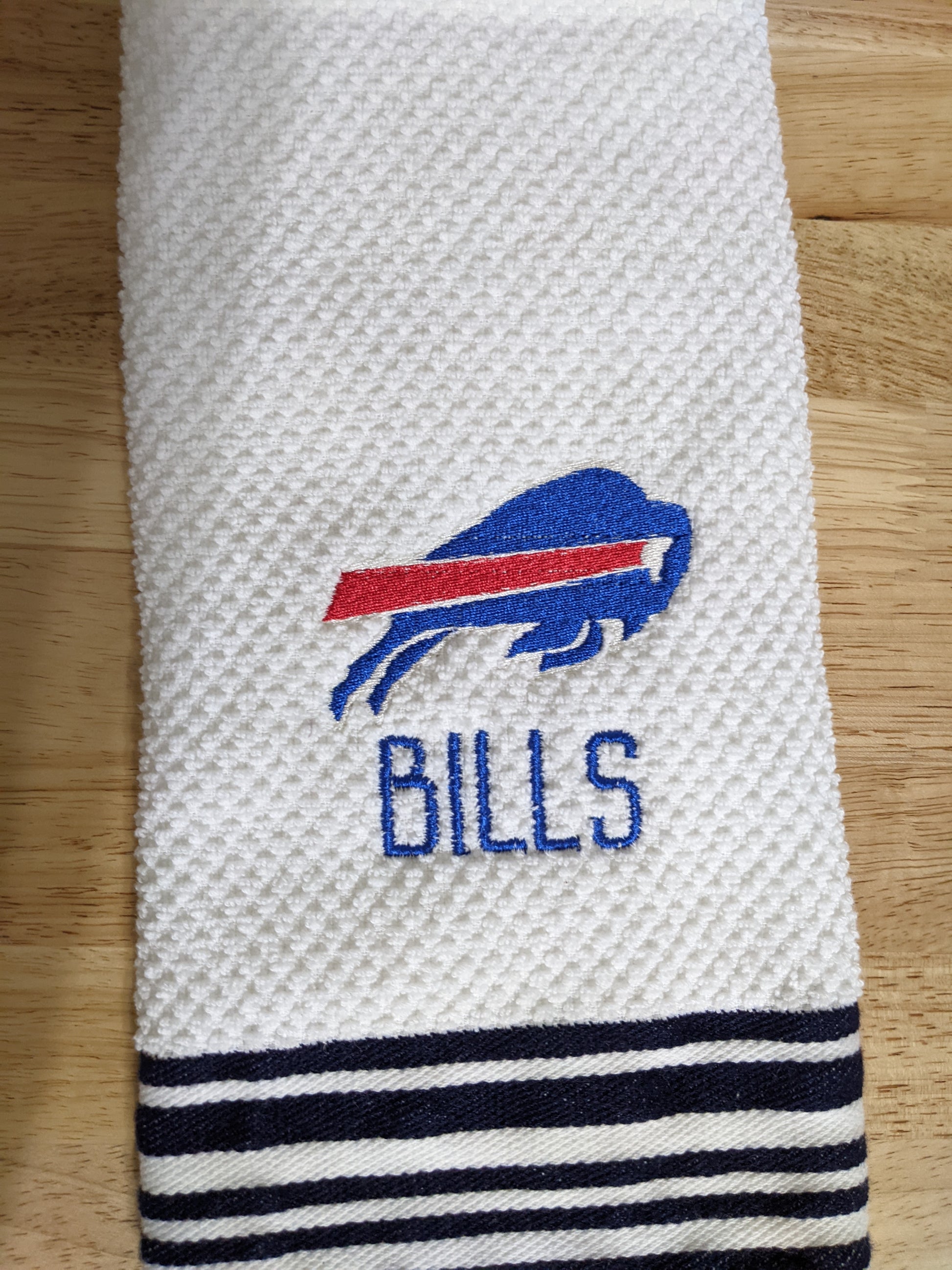 What a great way to show your support for the Bills! This dish towel has the Bills logo embroidered on it.  This would be a great gift for anyone who is a Bills fan and is great for a bar, man-cave or bathroom! I've also used these as a drying mats, not only to drip dry dishes/glasses, but also as a bar mat when entertaining guests.