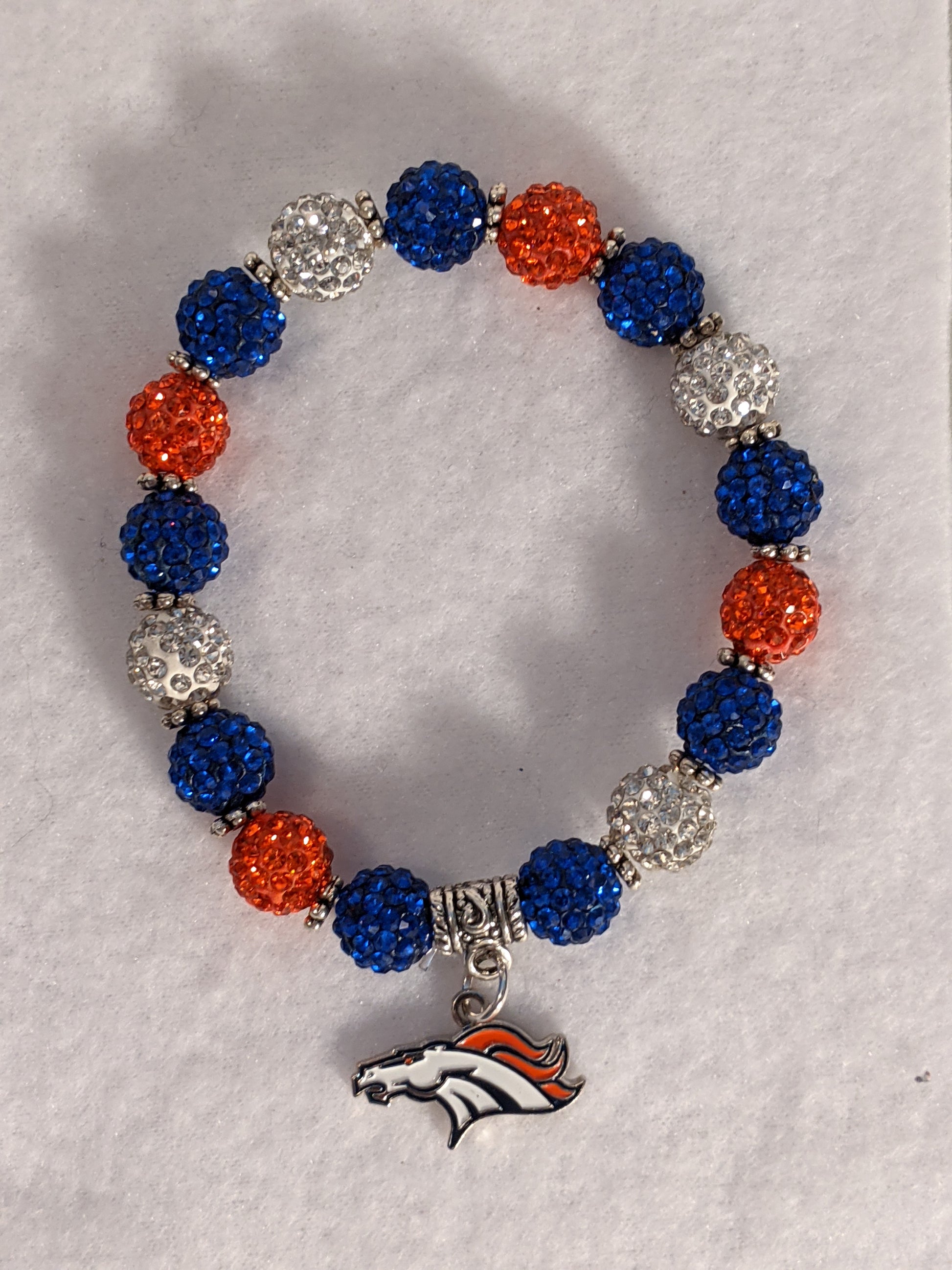 What a great way to show your Team Spirit and support of the Broncos! It is Orange, Blue and White with the Broncos Charm, and set with silver-tone spacer beads. This bracelet will easily match with other bracelets to create a stacked look!