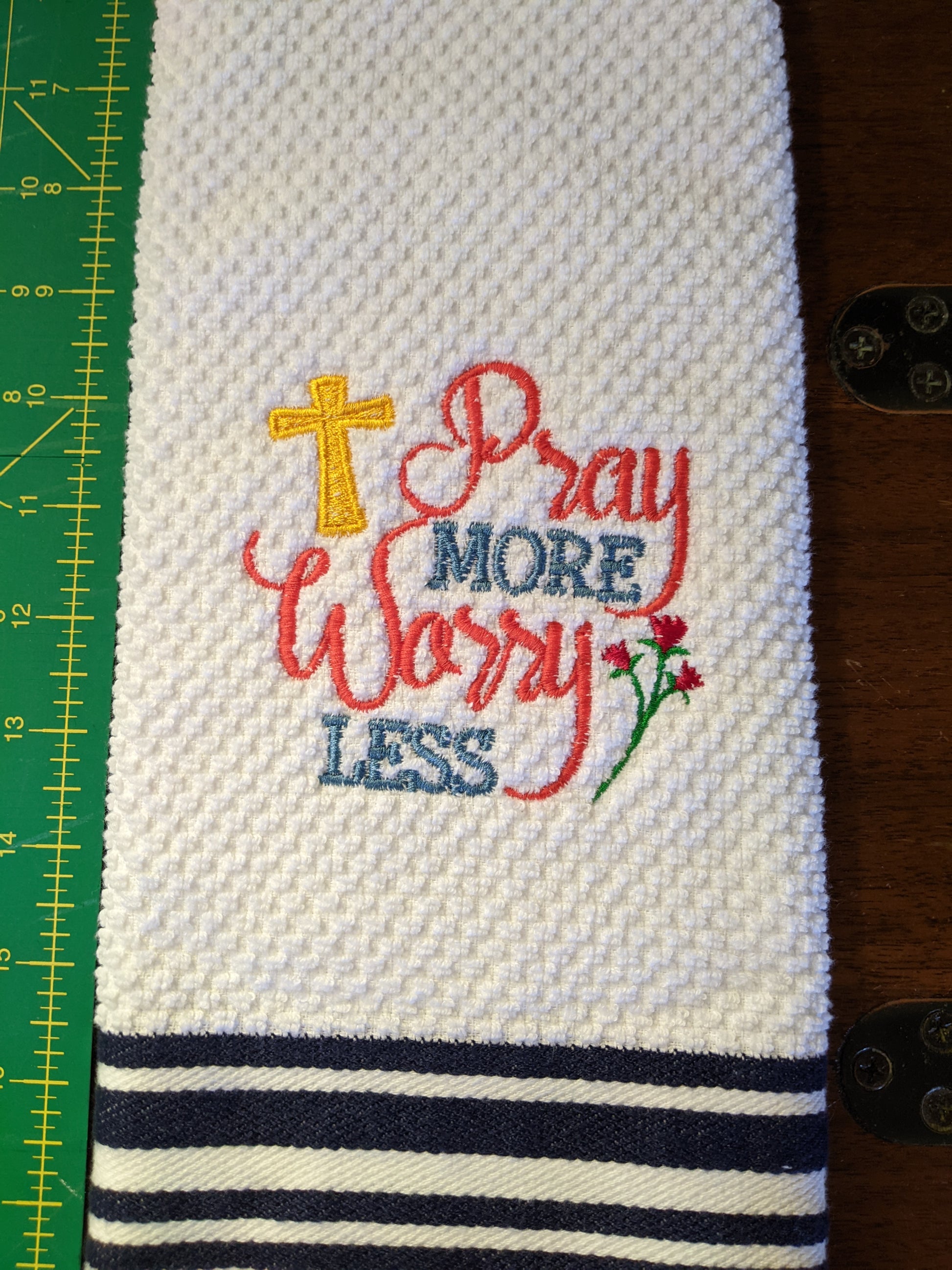 This is an embroidered kitchen towel with "Pray More, Worry Less". This would be a great gift or just treat yourself to a fun, new towel for your kitchen or bath!