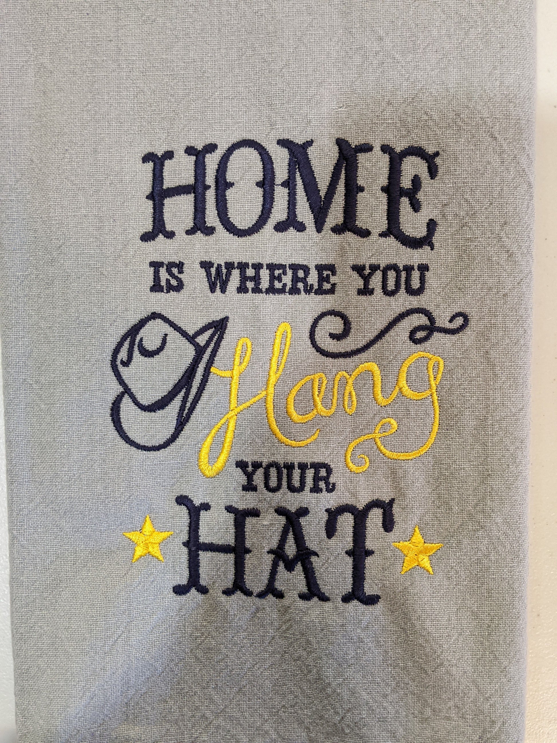 This is an embroidered kitchen tea towel. This towel has a  great outlook on life. Home Is Where You Hang Your Hat". This would be a great gift or just treat yourself to a new towel for your kitchen! This design is available in gray.