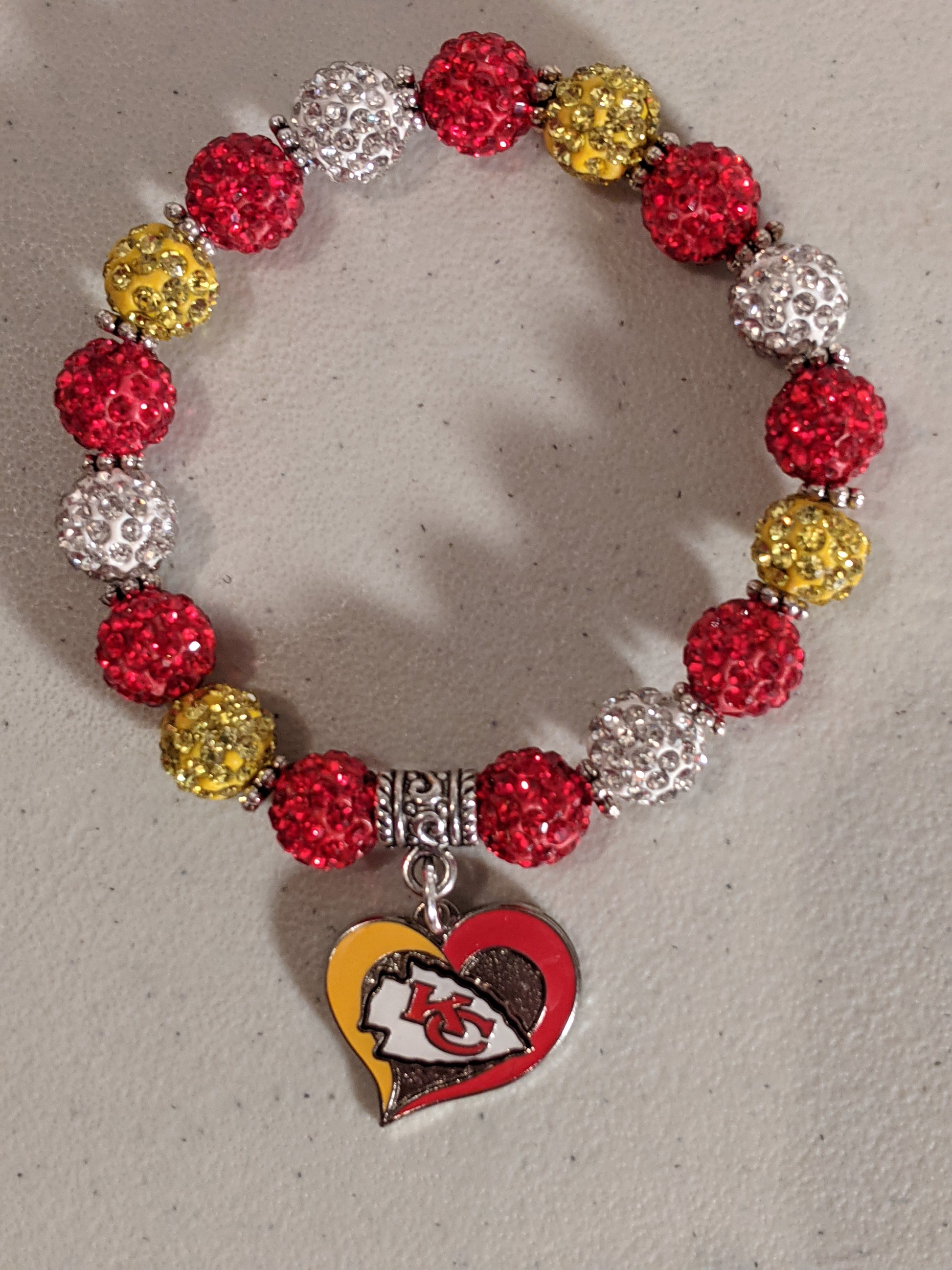 What a great way to show your Team Spirit and support of the Chiefs! It is Red, White  and Yellow with a heart charm that has the KC Chiefs logo attached, and set with silver-tone spacer beads. This bracelet will easily match with other bracelets to create a stacked look!