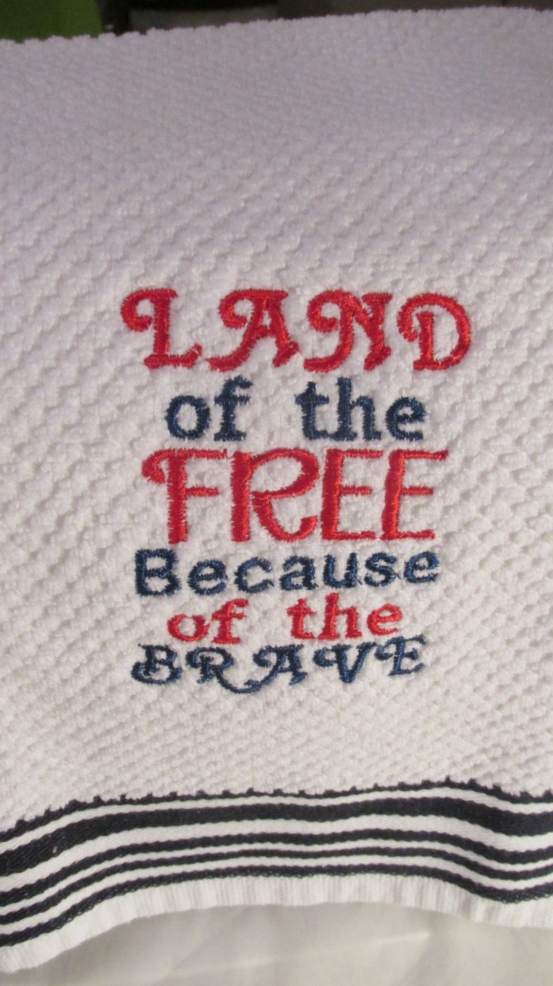 This is an embroidered kitchen towel with the words "Land of the Free Because of the Brave". This would be a great gift or just treat yourself to a fun, new towel for your kitchen or bath! Just choose your towel color below...