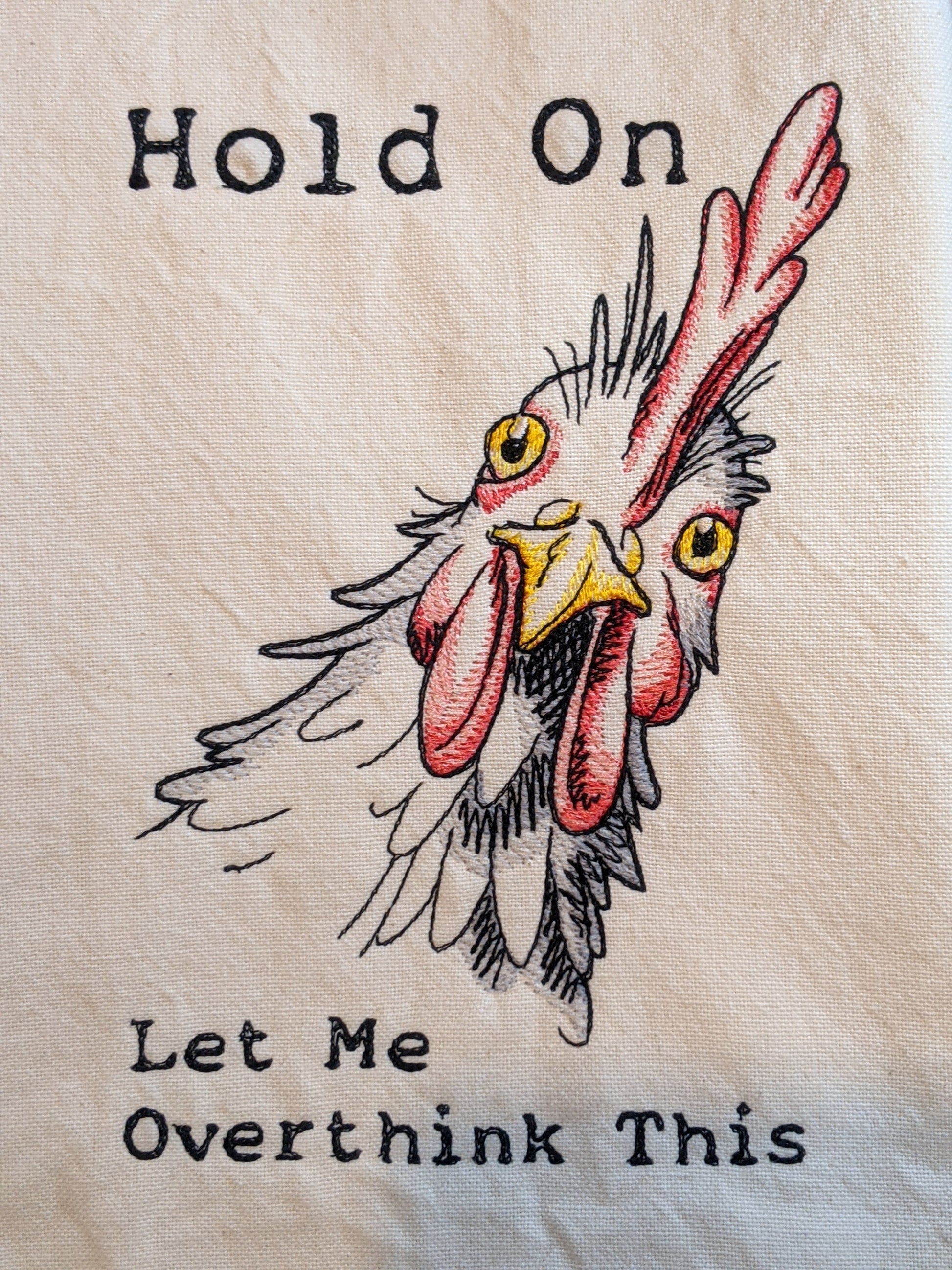 This is an embroidered kitchen tea towel. This towel has a funny chicken that is a little stressed out! "Hold on, Let me overthink this"! This would be a great gift or just treat yourself to a fun, new towel for your kitchen! This design is available in white or cream.