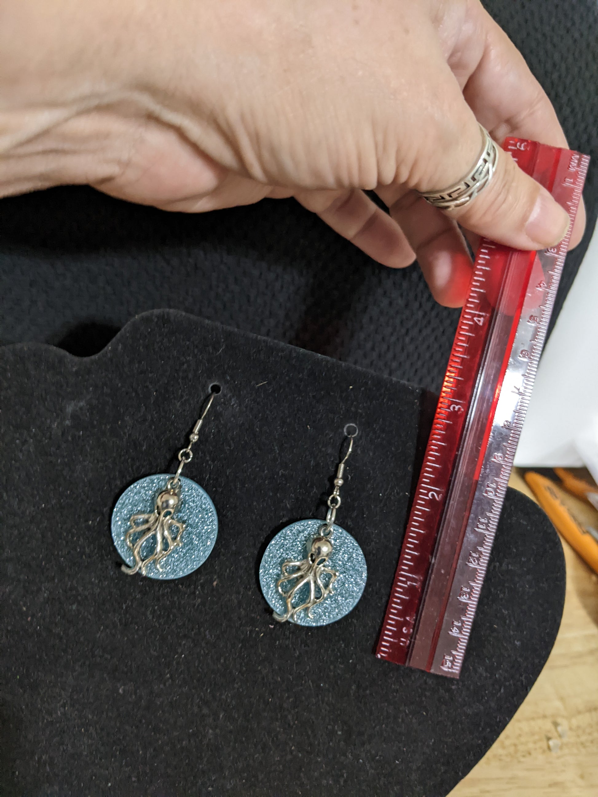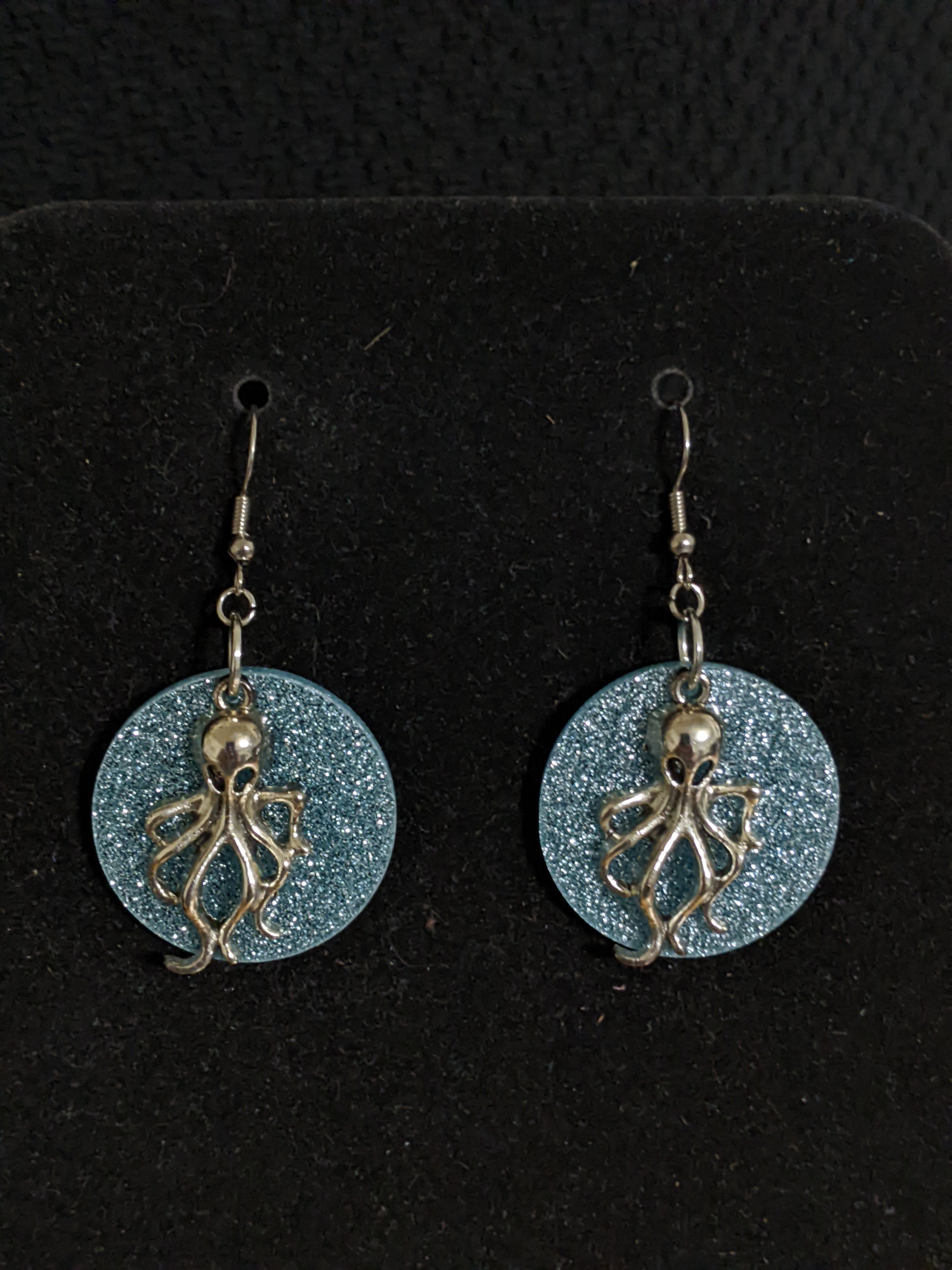 This pair is comprised of a silvertone Kraken charm against a glittery teal acrylic circle, and hung on fish hook wires. These are antique silver/pewter in color. The fish hook wires are nickel free, and I include plastic stops.
