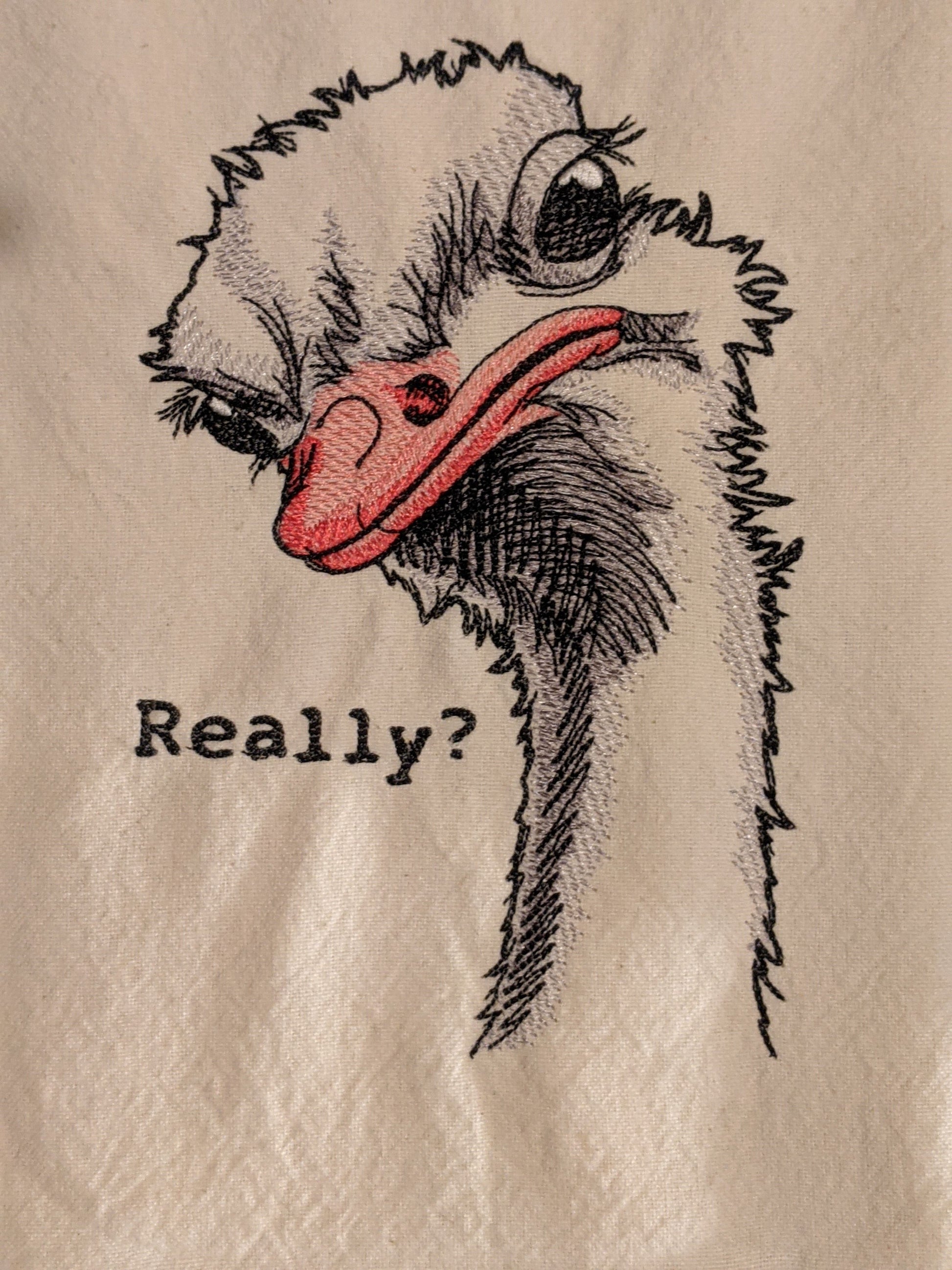 This is an embroidered kitchen tea towel. This towel has a funny ostrich that is questioning everything! "Really?"! This would be a great gift or just treat yourself to a fun, new towel for your kitchen! This design is available in white, cream or beige.