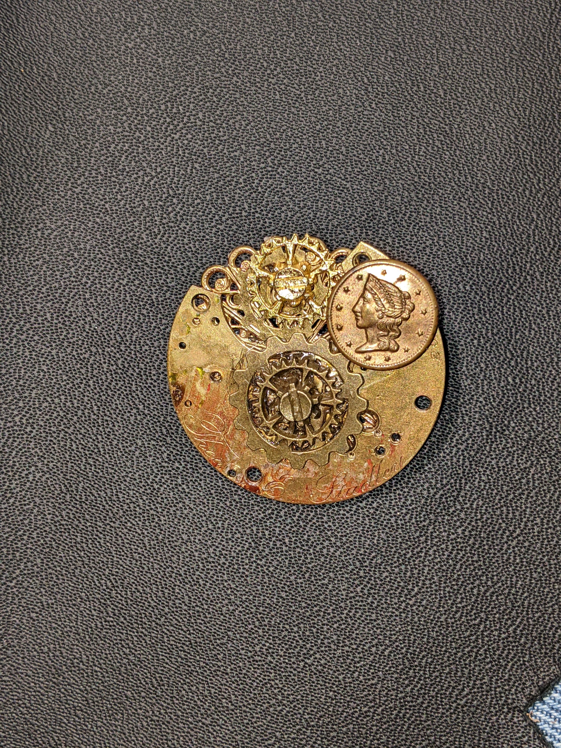 The picture depicts the pin on a piece of leather, as well as a piece of denim, to show you the contrast of the piece and how it might look on a jacket. The base piece is approx 1.75 x 1.75 inches in diameter.  It is antique brass in color.