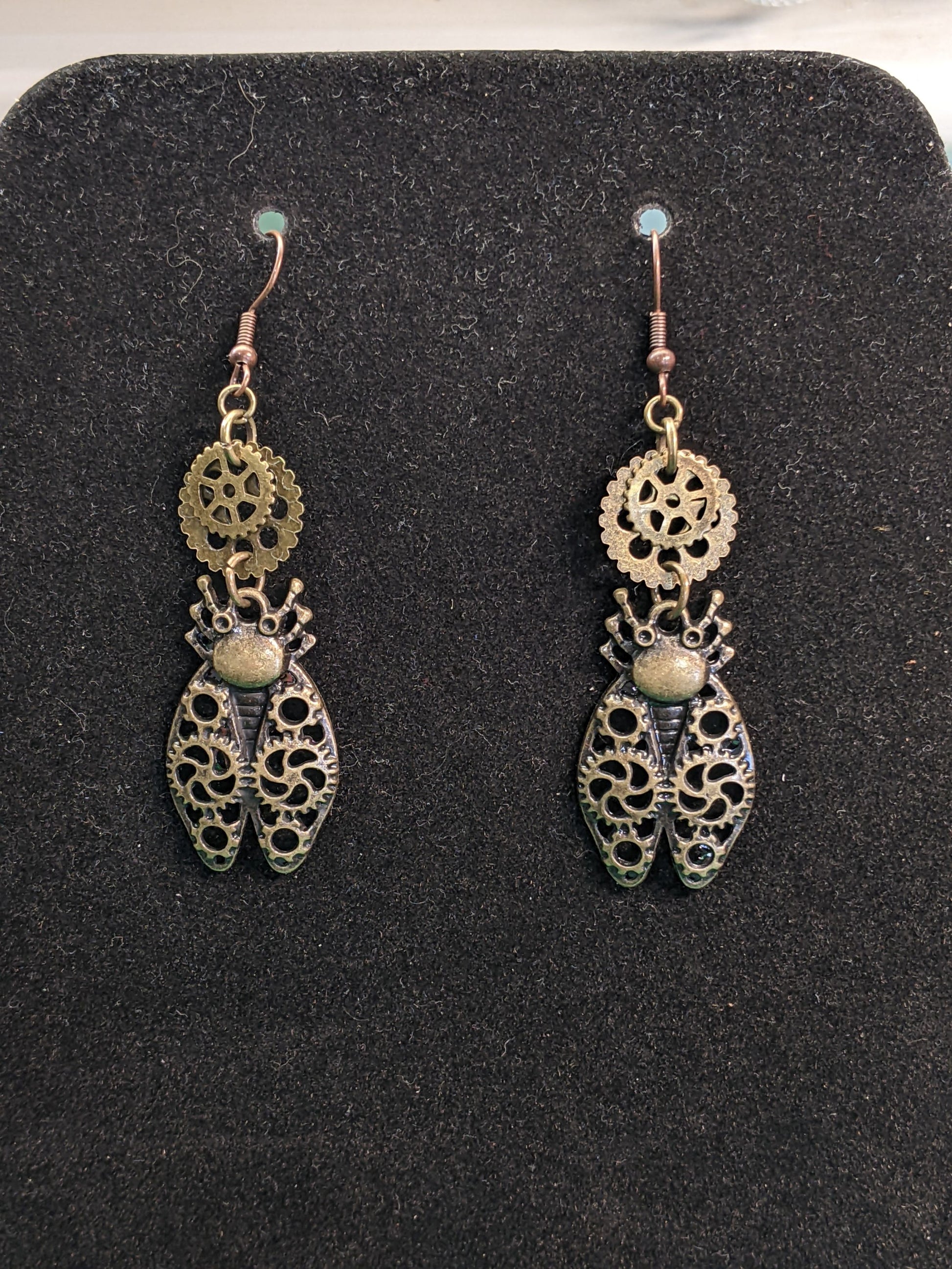This pair is comprised of a variety of gears and charms, and hung on fish hook wires. These are antique brass in color. The fish hook wires are nickel free, and I include plastic stops.