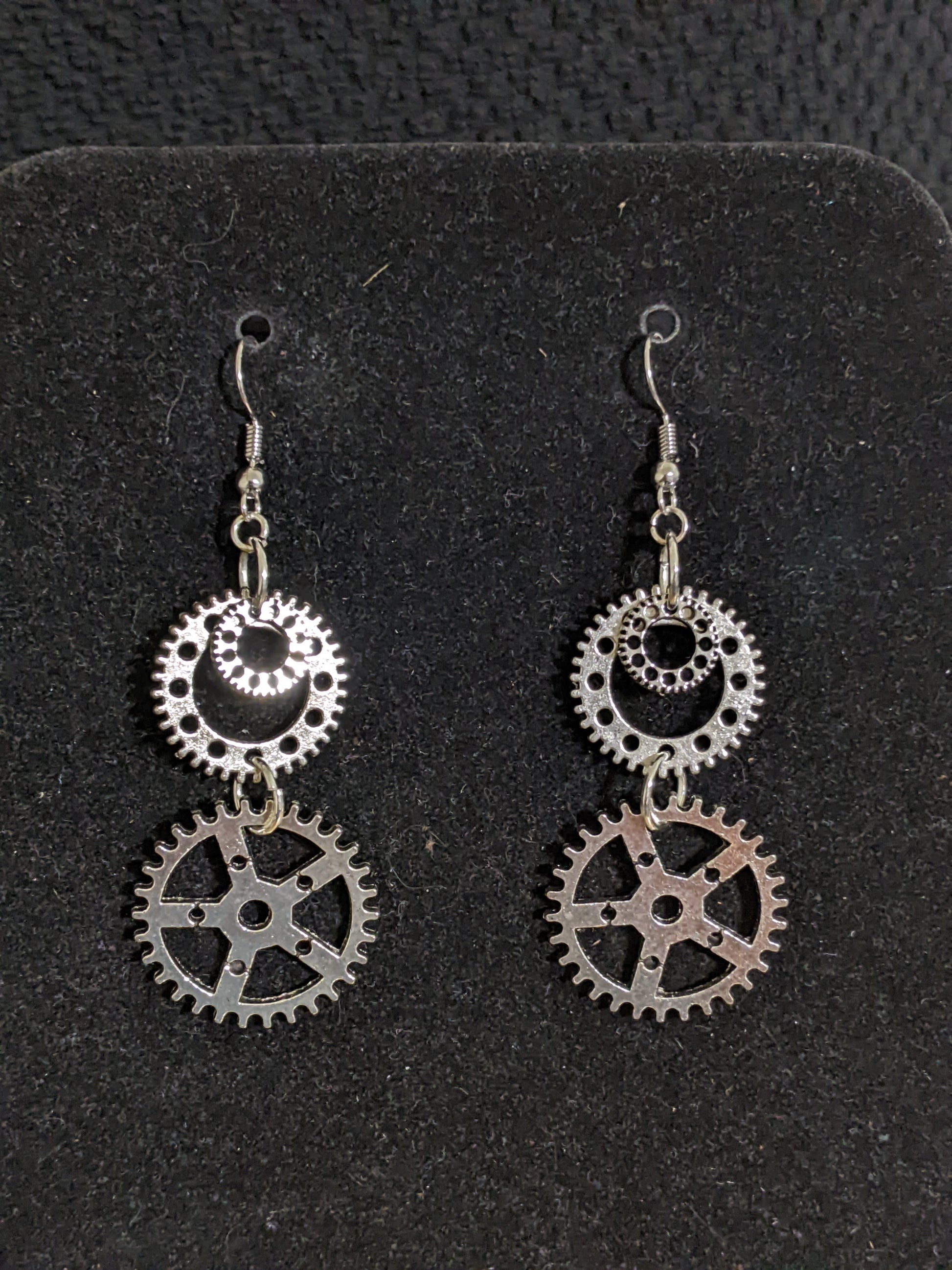 This pair is comprised of a variety of gears and hung on fish hook wires. These are antique silver/pewter in color. The fish hook wires are nickel free, and I include plastic stops.