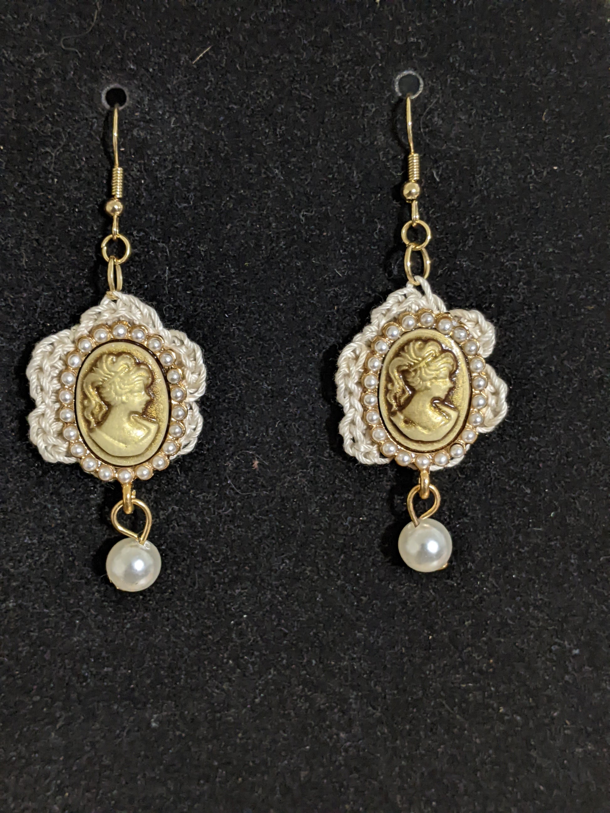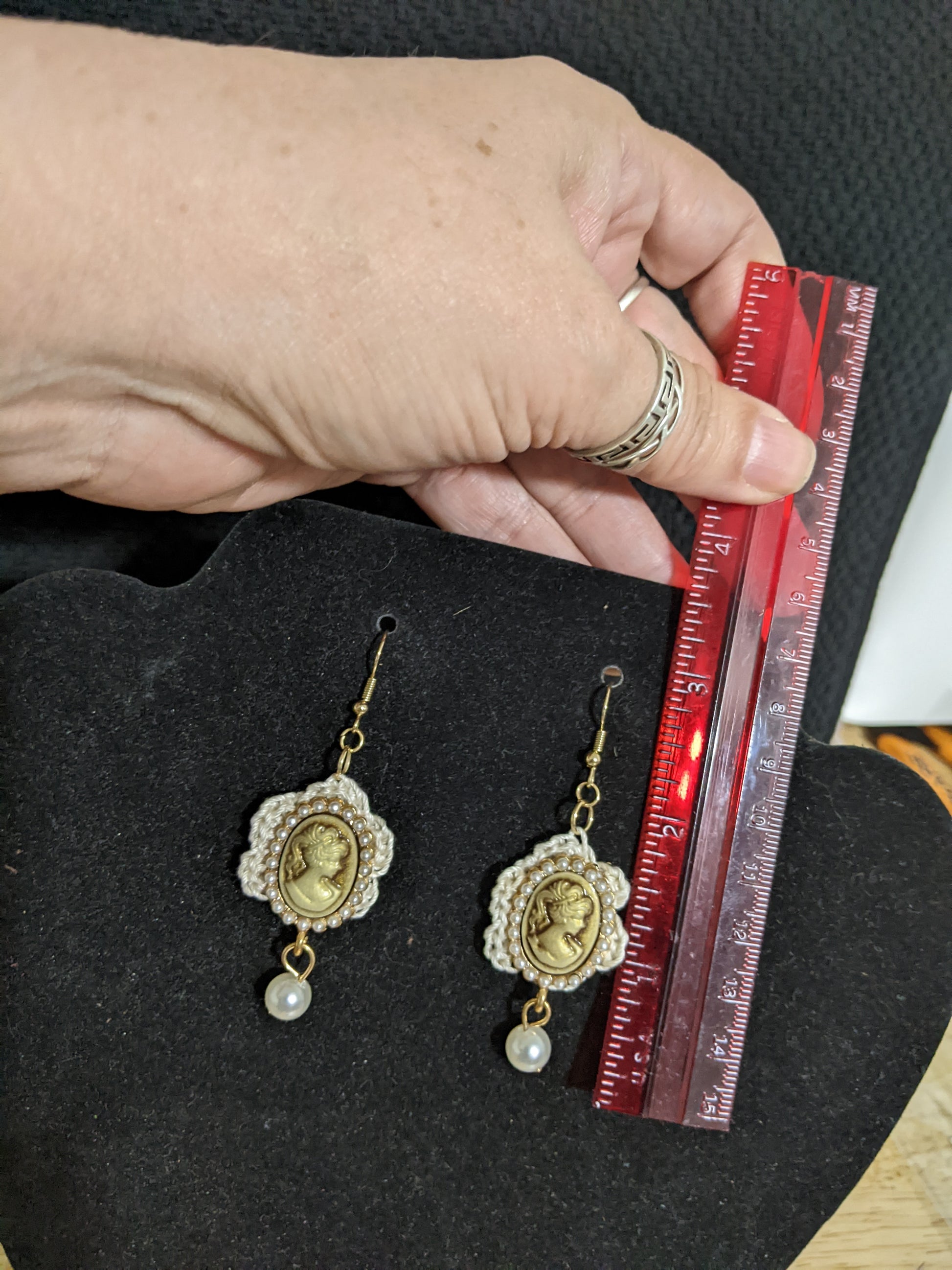 This pair is comprised of a vintage looking cameo that is framed with small faux pearls and a dangling pearly bead. This cameo is set on a small, crochet doily for the back drop to give it a real vintage look. These are hung on fish hook wires. These are antique brass in color. The fish hook wires are nickel free, and I include plastic stops.