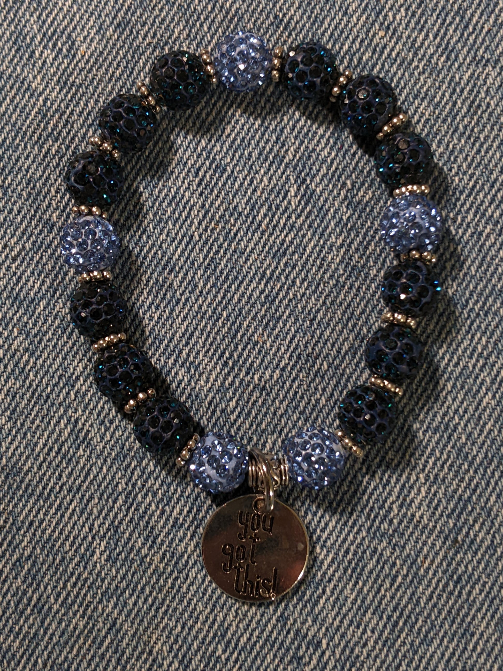 This is a stretchy bracelet with a silvertone charm that says "You Got This". The beads are different shades of blue with silvertone spacer beads.