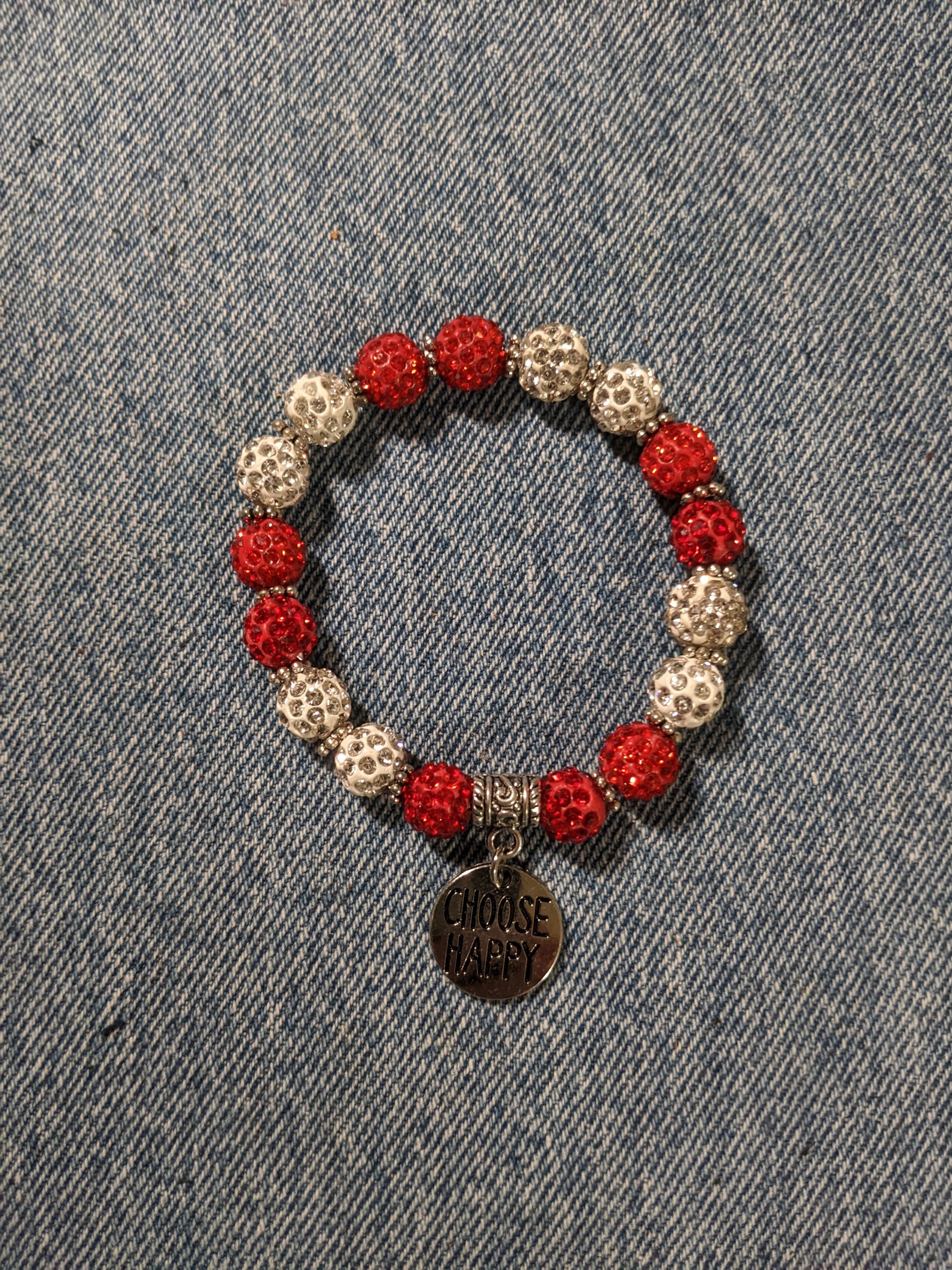 This is a stretchy bracelet with a silvertone charm that says "Choose Happy". The beads are red and white with silvertone spacer beads.