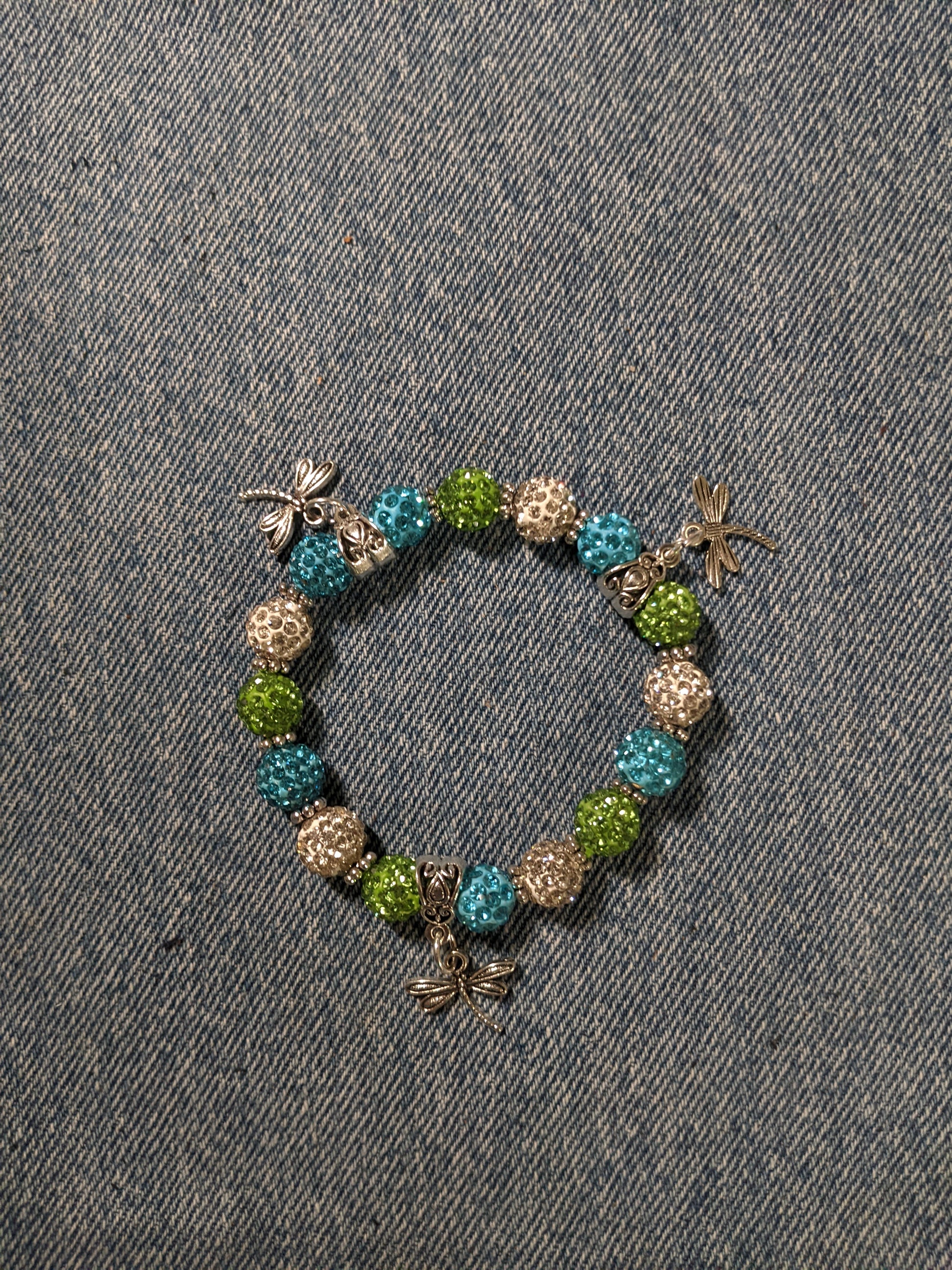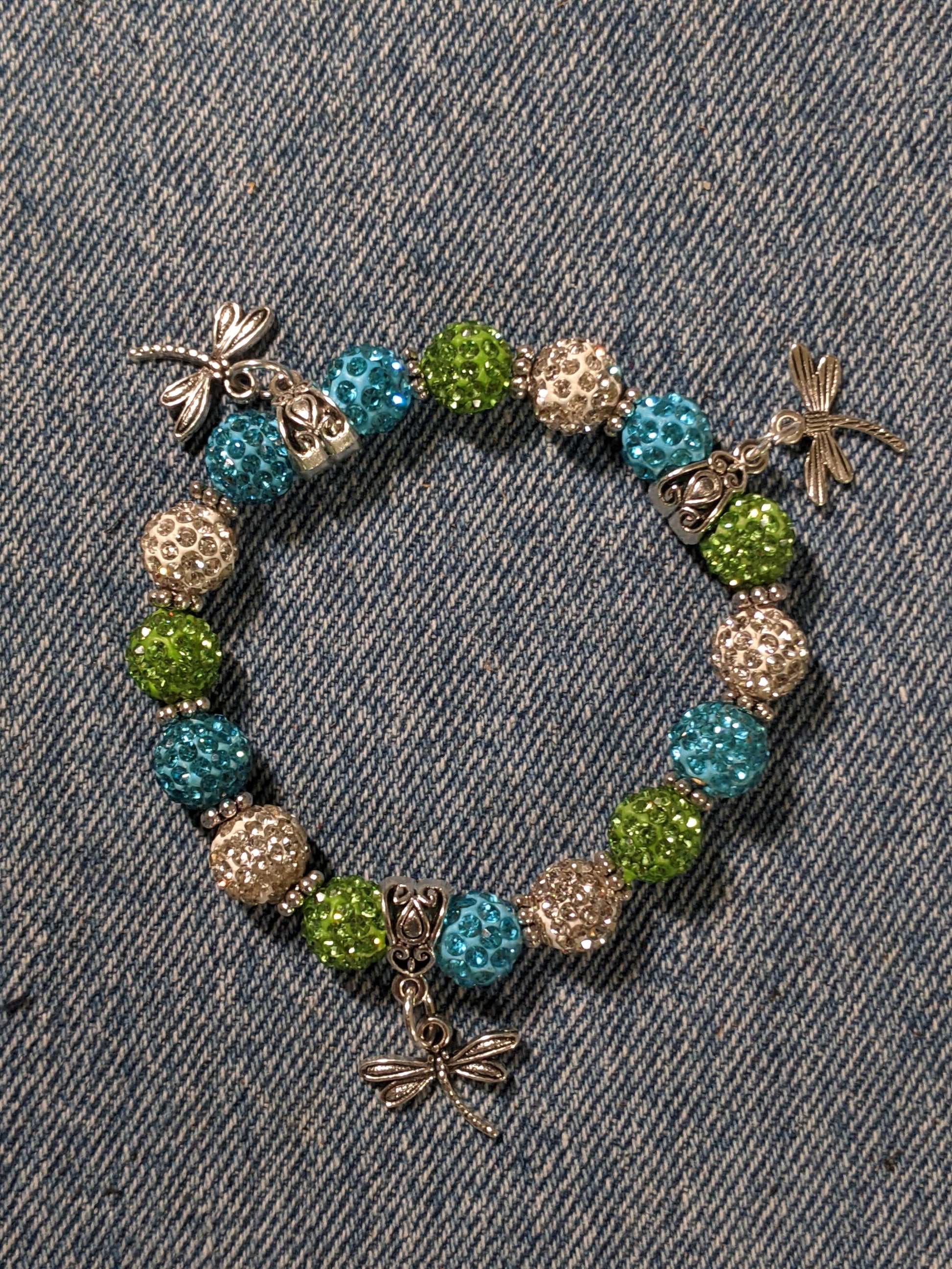 This is a stretchy bracelet with 3 dragonfly charms. The beads are teal, light green and white with silvertone spacer beads.
