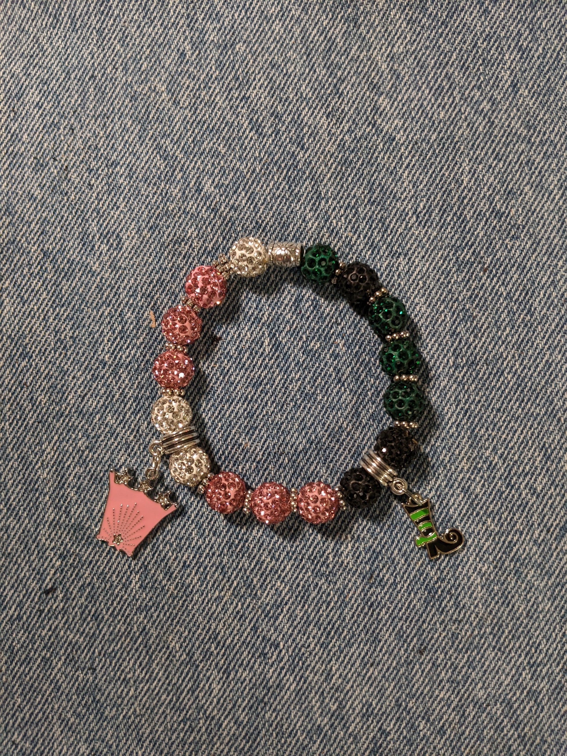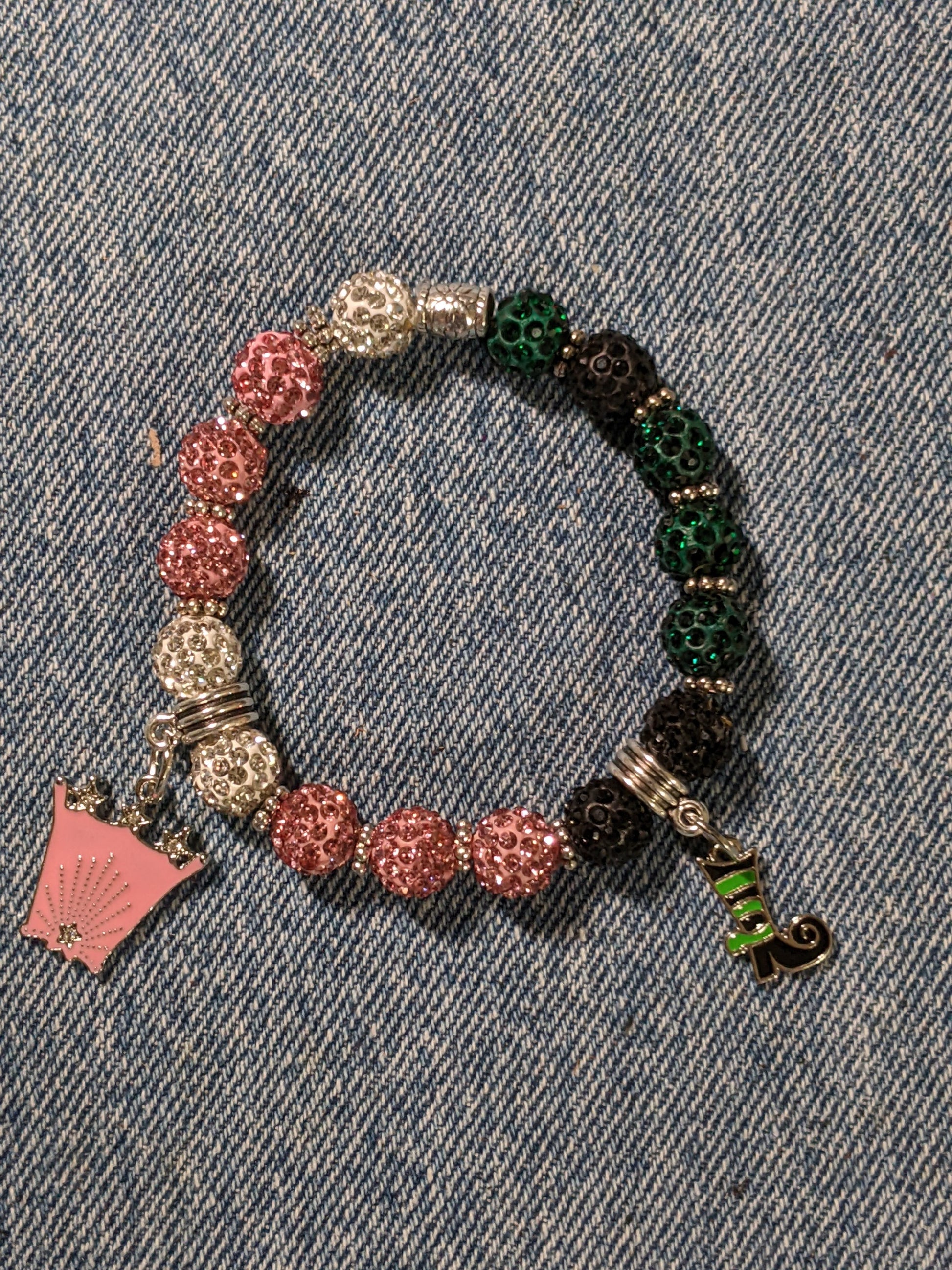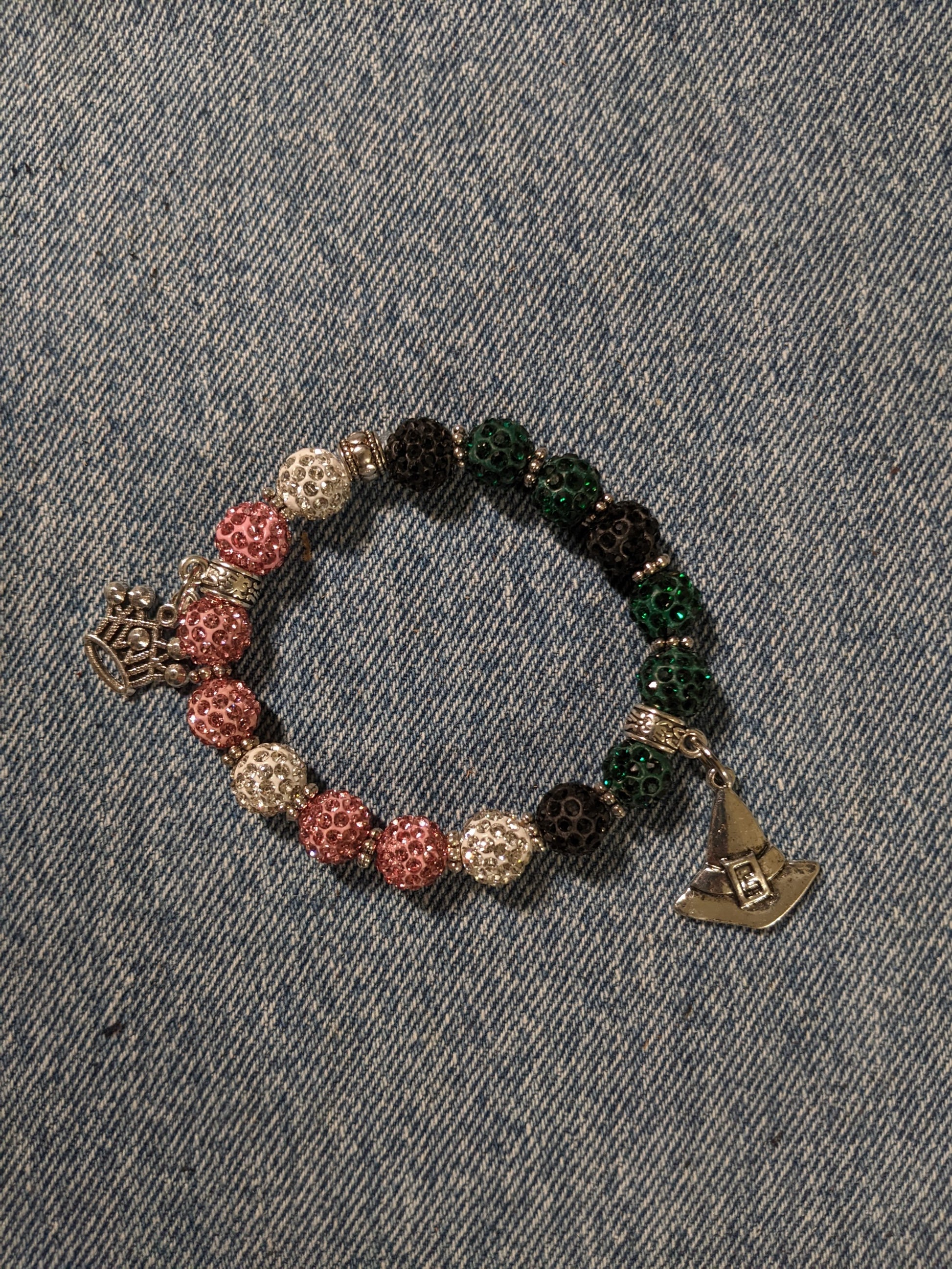 This is a stretchy bracelet in the "Wicked" theme. I have 2 variations available. They have Pink and White beads on one half and then Green and Black beads on the other half. Then there are a crown and a witches boot charms attached