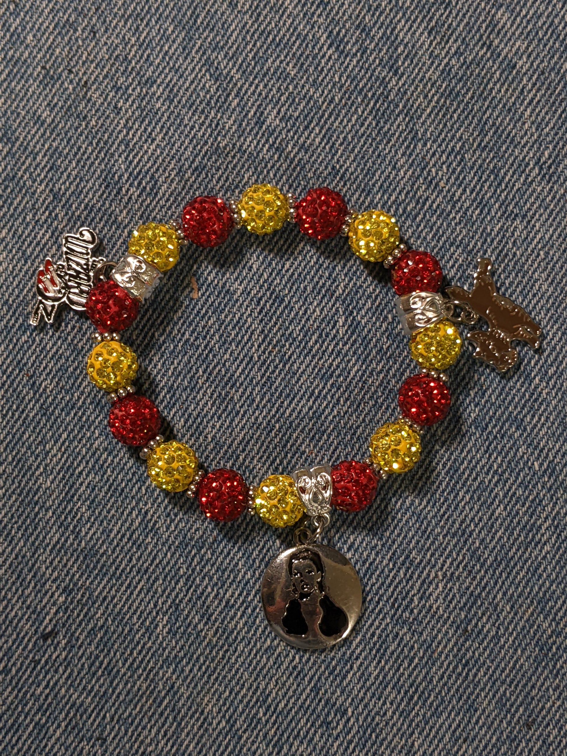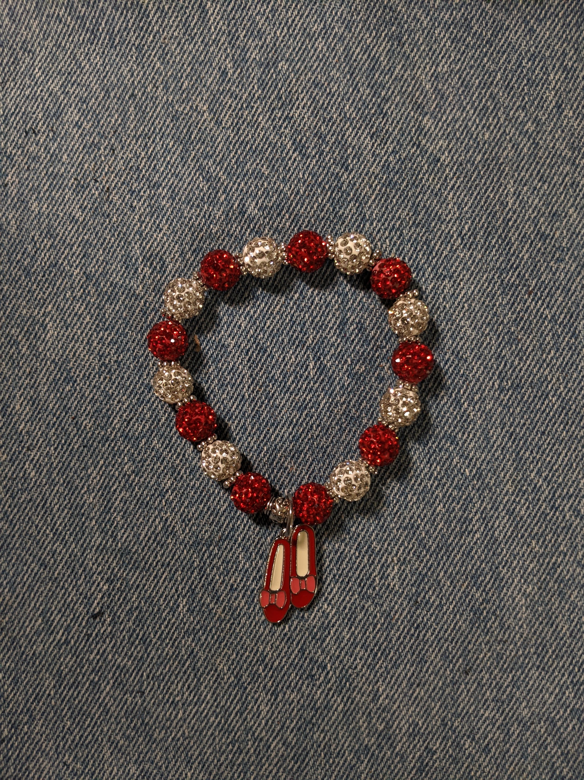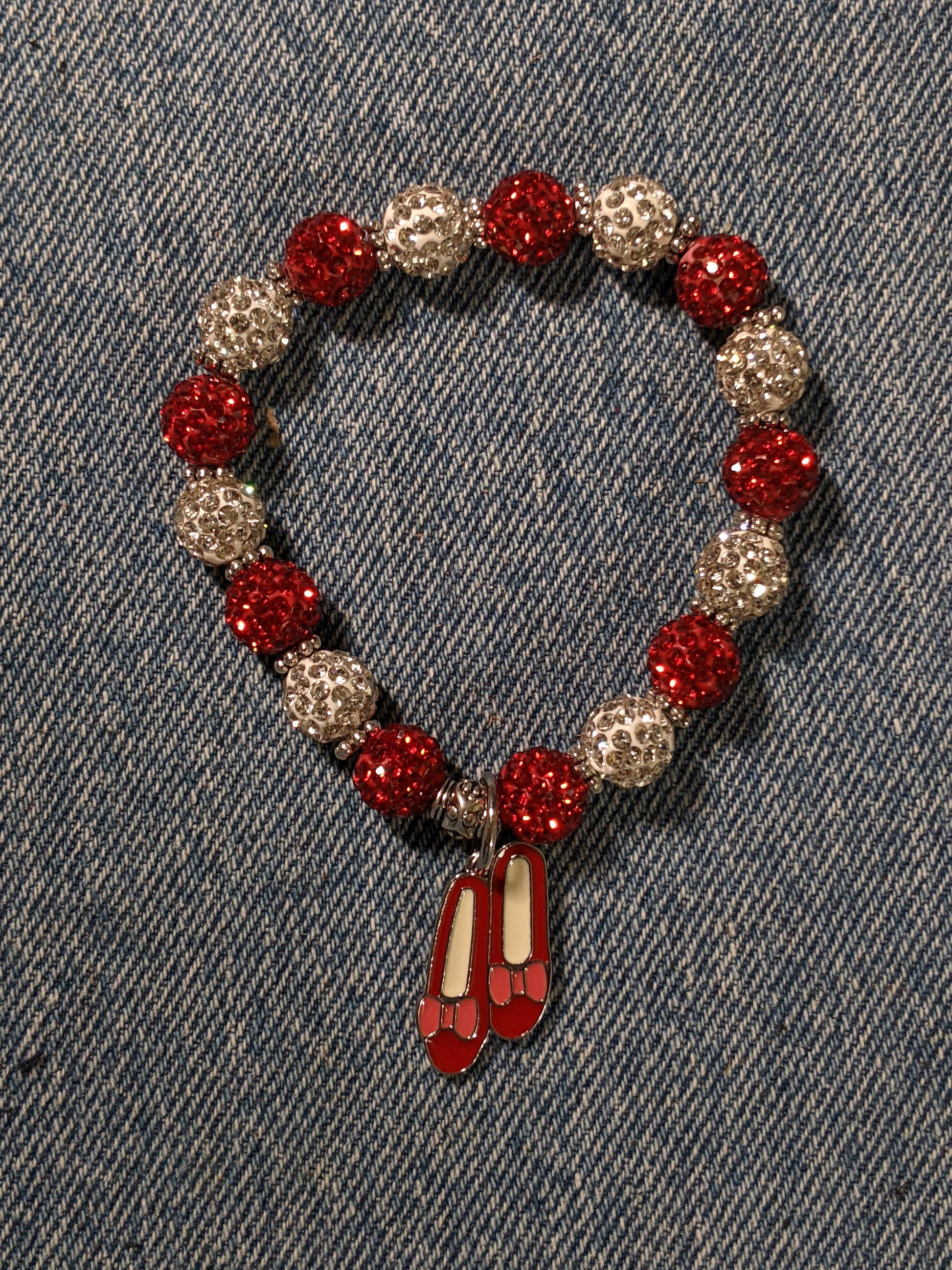 This is a stretchy bracelet in the "Wizard of Oz" theme. I have 2 variations available. Version A is red and white, with a ruby red slippers charm. Version B is red, white and yellow with 3 charms-Dorothy, Toto and Wizard of Oz.
