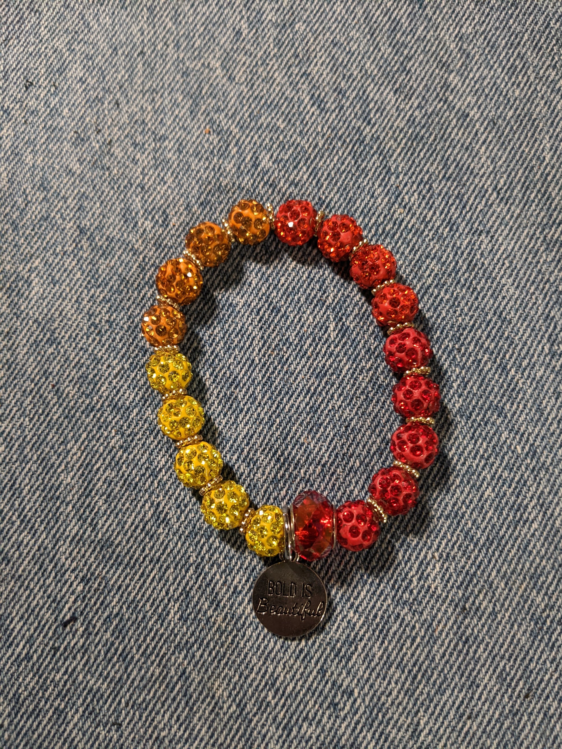 This is a stretchy bracelet with a silvertone charm that says "Bold Is Beautiful". The beads are red, yellow and orange with silvertone spacer beads.