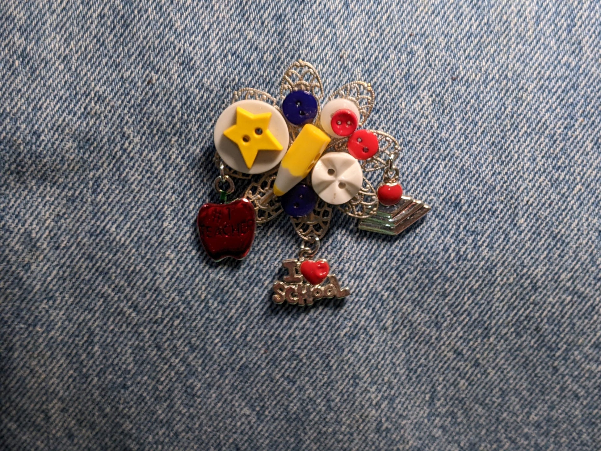 I handcraft each of these pins/brooches, with buttons, jewelry pieces and unique charms to create a one of a kind piece of jewelry! No 2 pins are ever alike, so you are truly buying a one of a kind item!