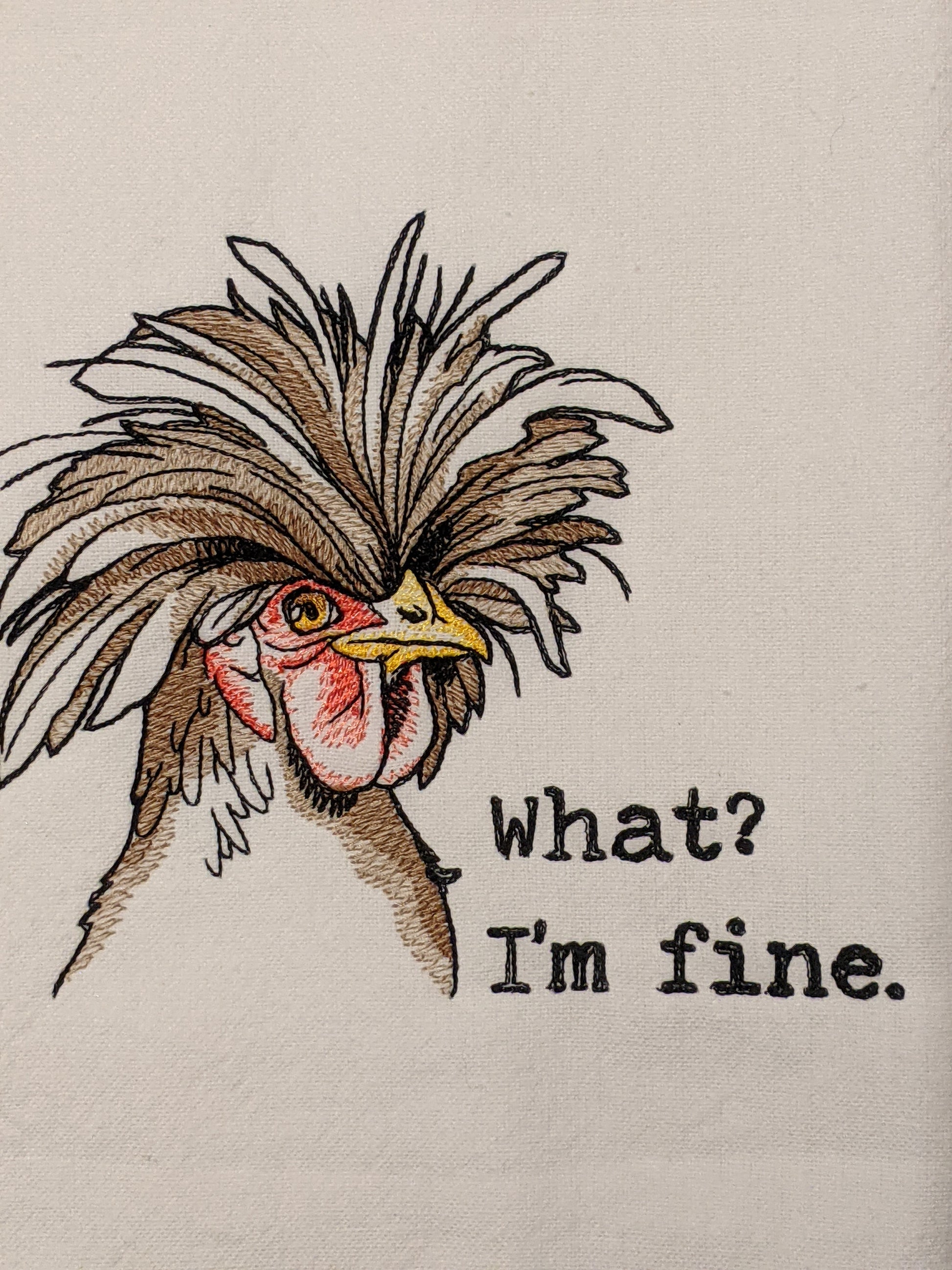 This is an embroidered kitchen tea towel. This towel has a funny chicken that is a little stressed out! "What? I'm fine"! This would be a great gift or just treat yourself to a fun, new towel for your kitchen! This design is available in white or cream.